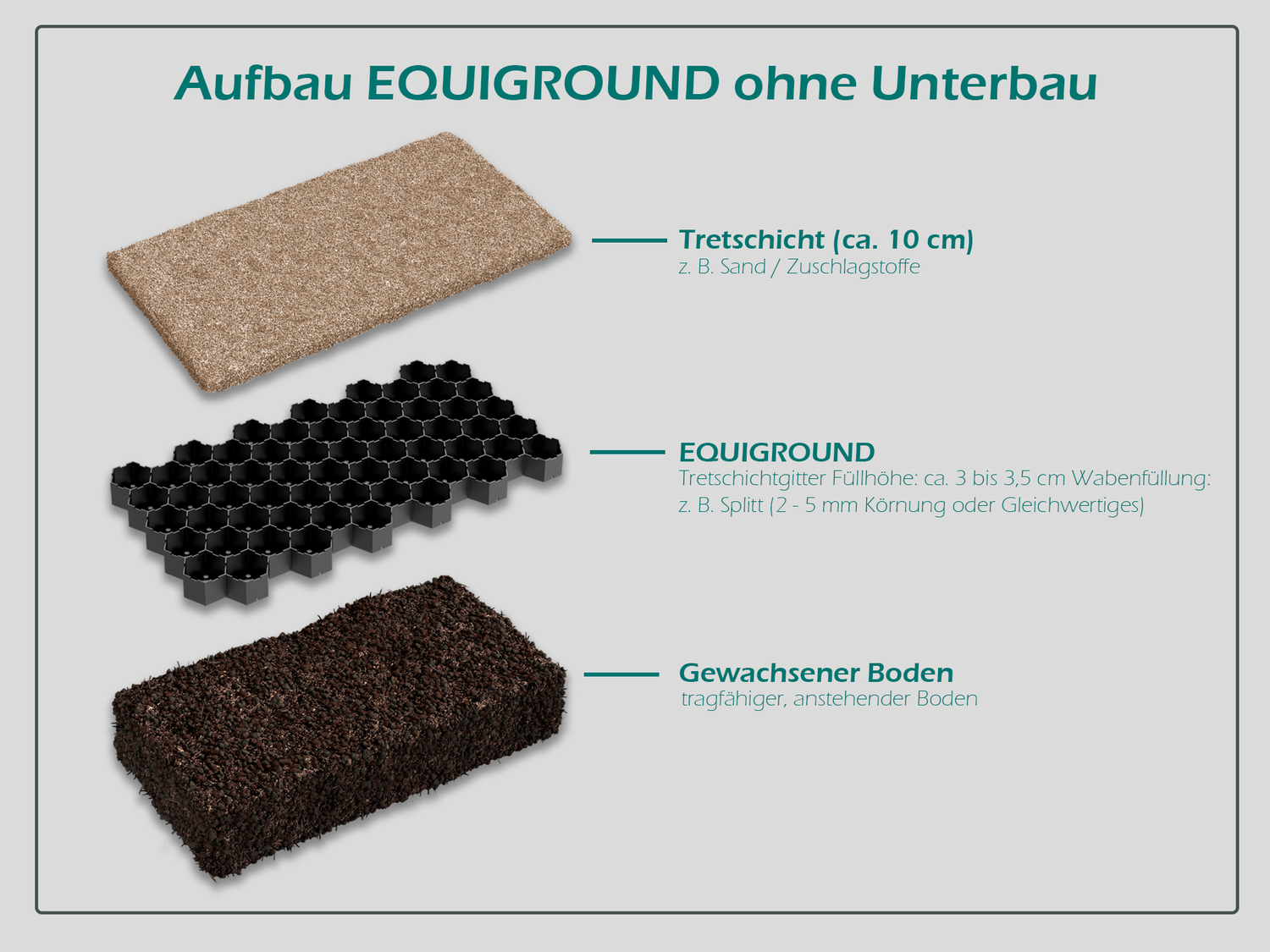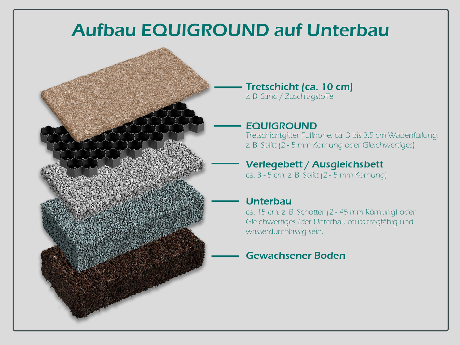 - EQUIGROUND: Tretschichtgitter Füllhöhe: ca. 3 bis 3,5 cm Wabenfüllung: z. B. Splitt (2 bis 5 mm Körnung) oder Gleichwertiges